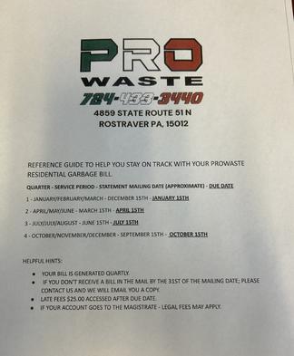 PRO WASTE WILL TAKE OVER AS LIBERTY BOROUGH'S WASTE CONTRACTOR BEGINNING JANUARY 1, 2025 FOR THE DURATION OF 3 YEARS. IN THE FIRST YEAR, THE MONTHLY FEE WILL BE $19.75 PER HOUSEHOLD,AND BILLING WILL BE QUARTERLY. EXPECT TO RECEIVE YOUR INITIAL STATEMENT THIS WEEK. IF YOU HAVEN'T RECEIVED YOUR STATEMENT IN THE NEXT WEEK OR SO, PLEASE CONTACT PRO WASTE @ 724-433-3440 TO INQUIRE ABOUT YOUR BILLING STATEMENT. THANK YOU FOR YOUR COOPERATION & UNDERSTANDING.
